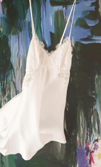 Descubre el camisón corto "Bassin", inspirado en los 'Water Lilies' de Monet. Este camisón presenta detalles de encaje bordado en el escote frontal, y en la abertura de la pierna, está confeccionado en satín stretch y tiene un detalle de doble tirante ajustable que resalta feminidad y elegancia. Combínalo con la bata "Alice" para crear el look perfecto.