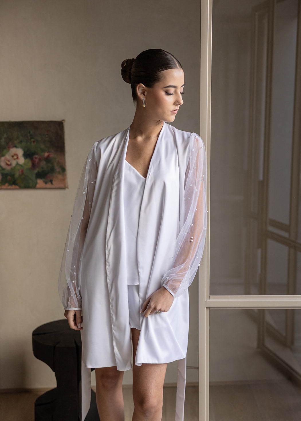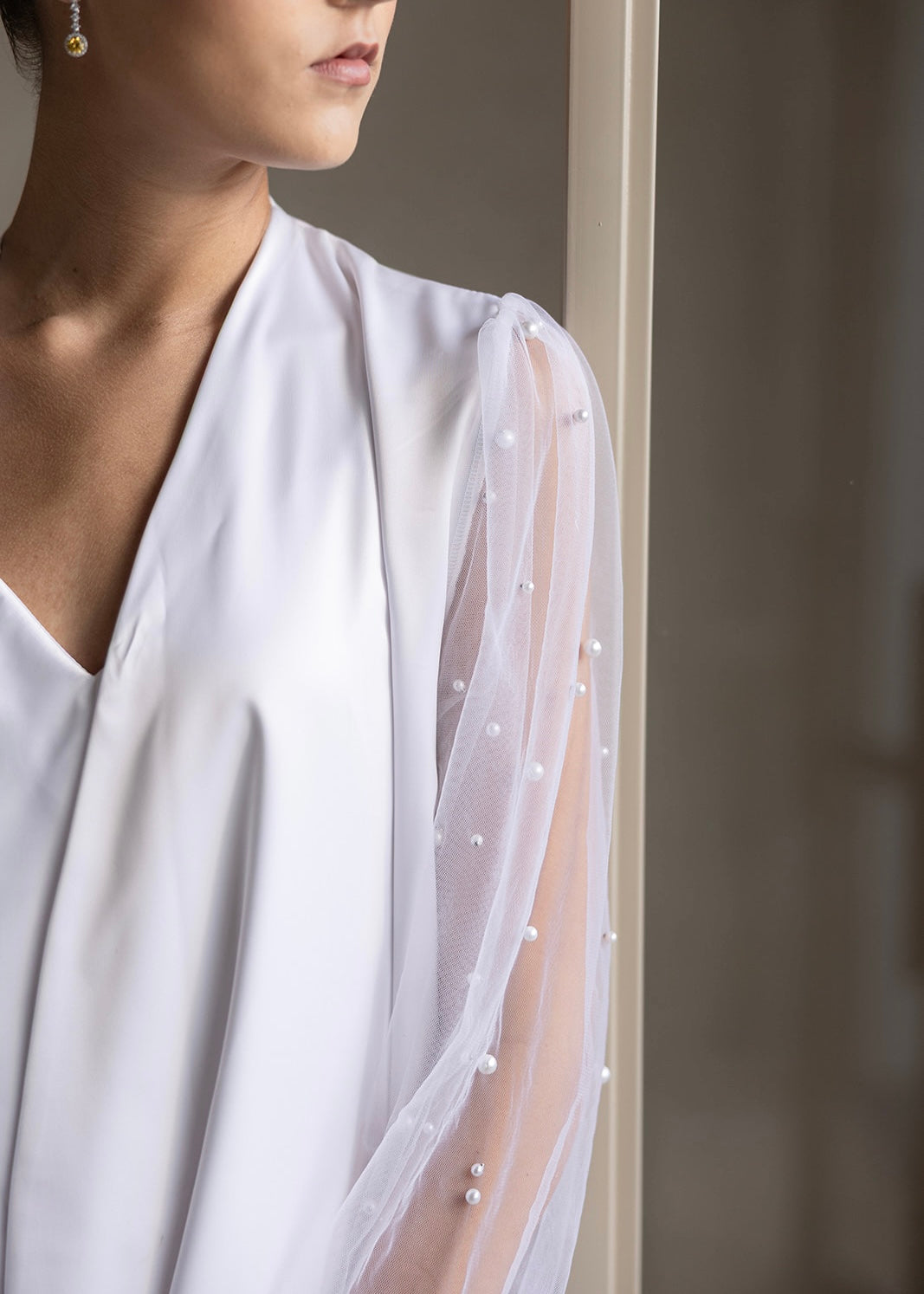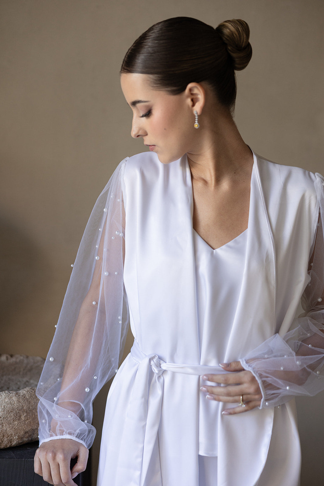 Bata de satín con tul de perlas.
