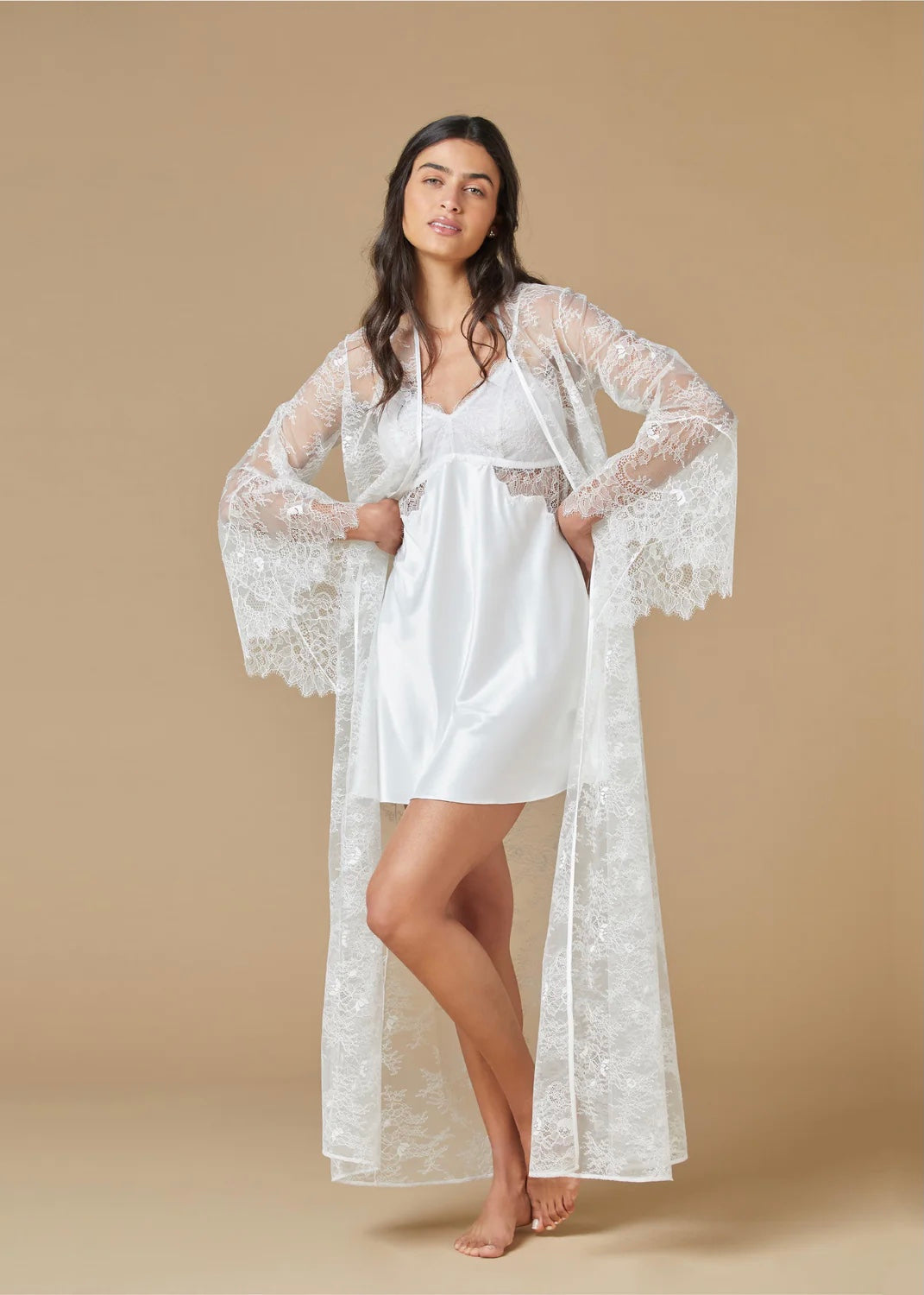 En el día de tu boda, cada detalle importa, y tu getting ready. La Bata Lana ha sido diseñada meticulosamente para ser la compañera perfecta durante esos momentos mágicos previos a tu boda. Esta pieza única, con encaje de la más alta calidad, elevará tu experiencia de getting ready a un nivel de sofisticación inigualable.