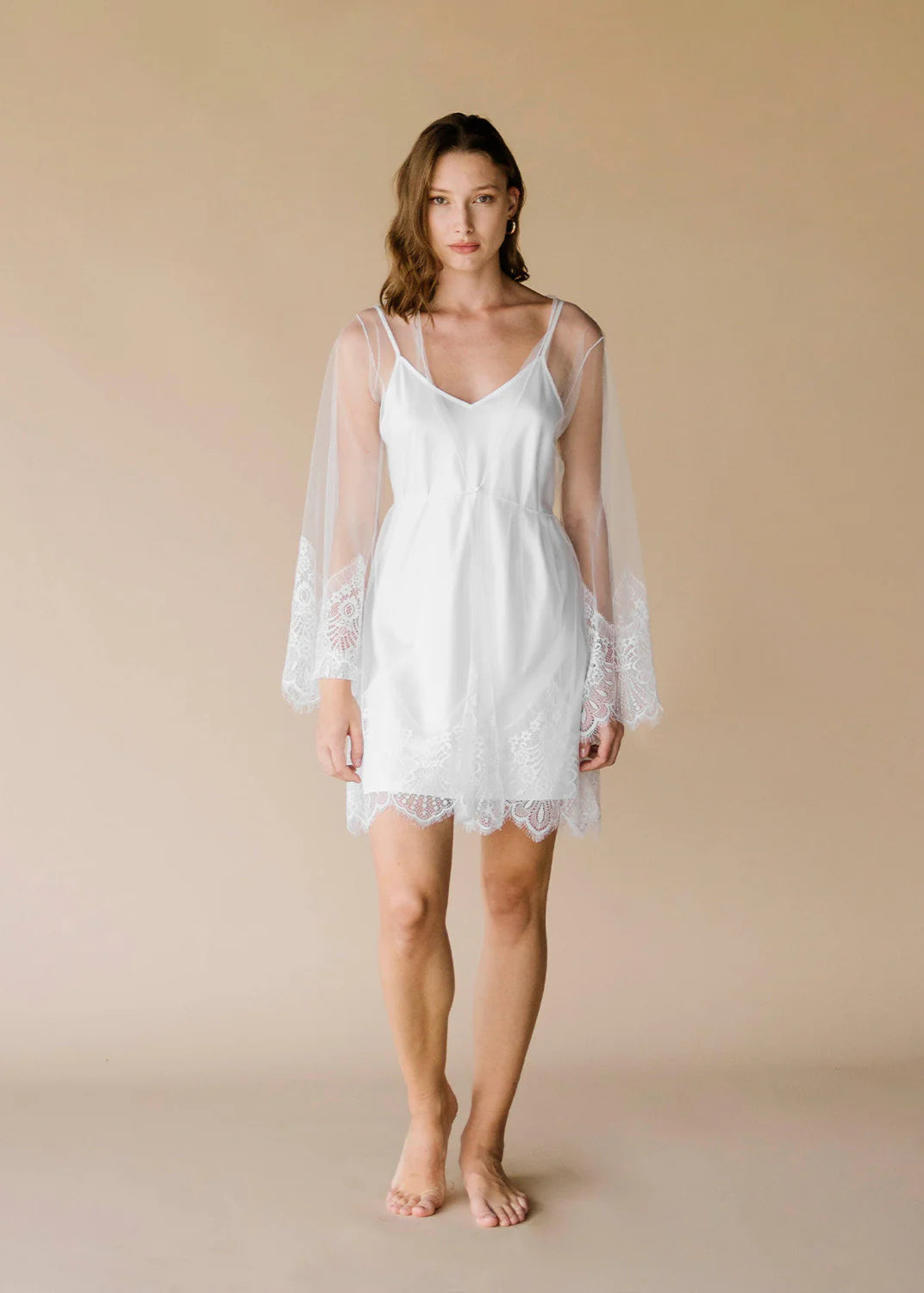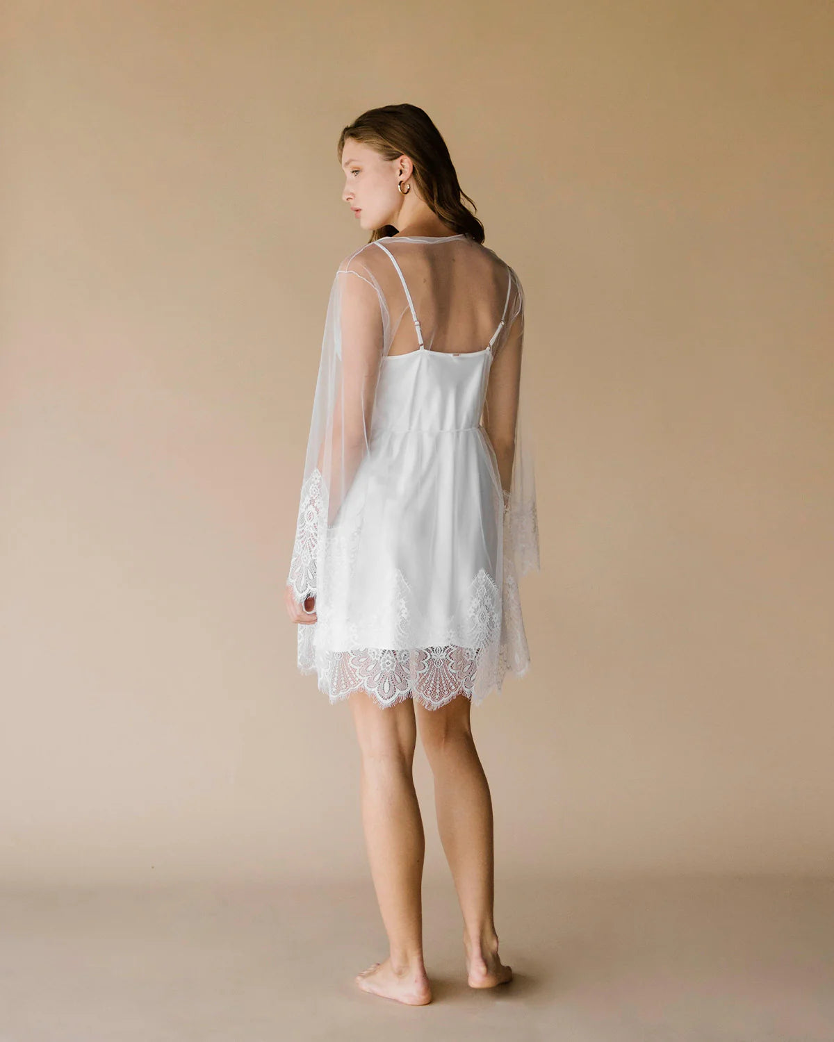 La bata corta "Obi" es una prenda elegante y sofisticada. Su diseño de corte recto con encaje bordado le da un toque delicado, mientras que sus mangas estilo kimono aportan un aire clásico. Hecha de tul transparente, resalta la feminidad y el glamour. Puede combinarse con el conjunto de lencería Ninpheas o usarse sobre un vestido o pantalones, asegurando un look inolvidable en cualquier ocasión.