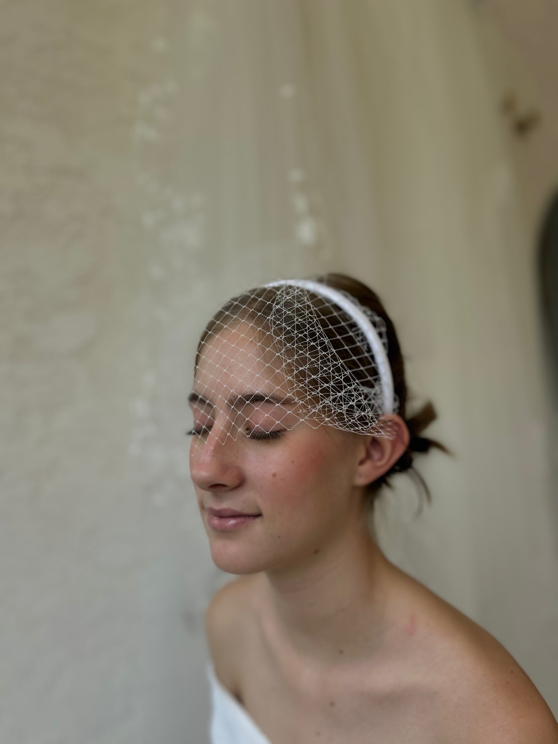 Diadema blanca con tul de reja.