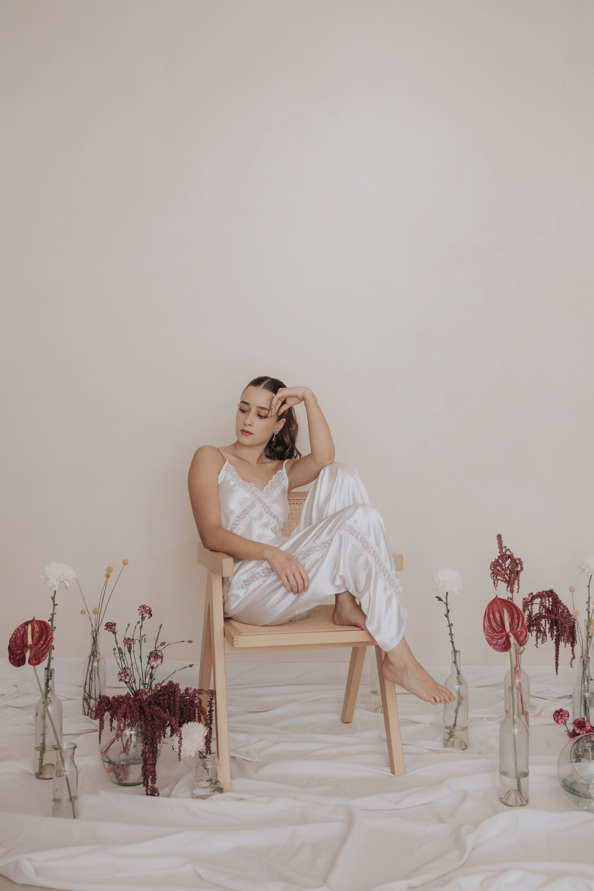 Set de blusa y pantalón de satín suave con delicados detalles de encaje.
