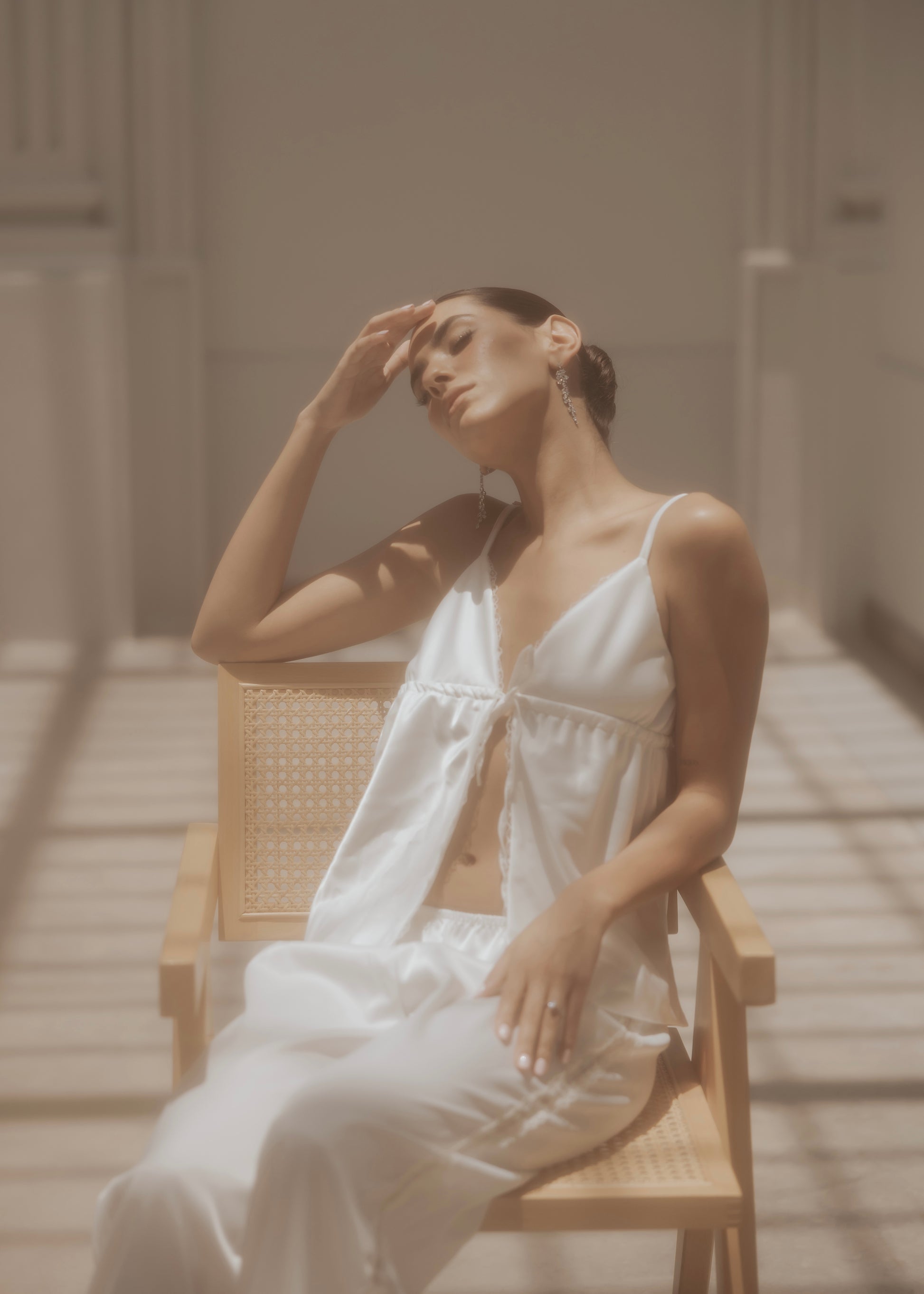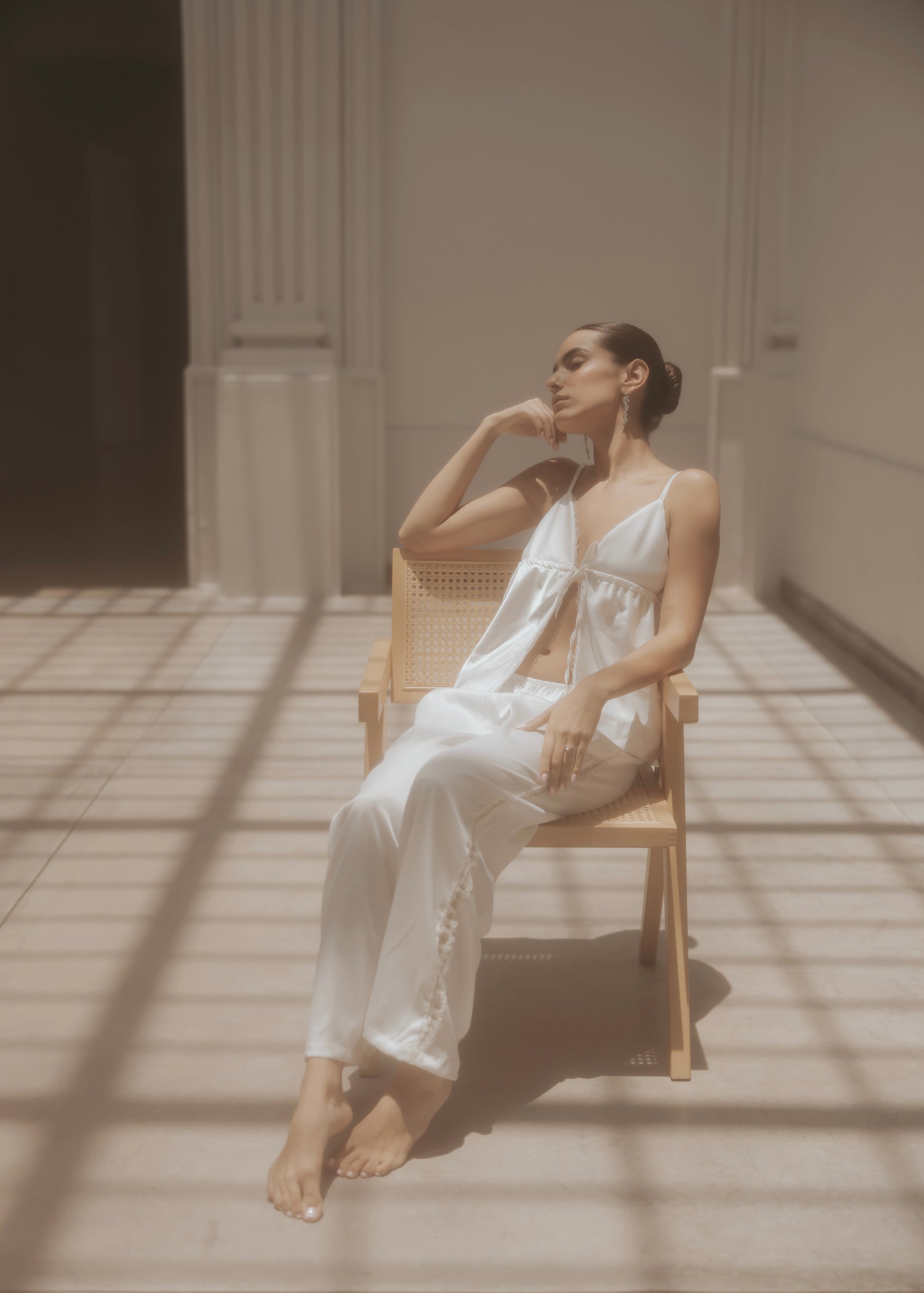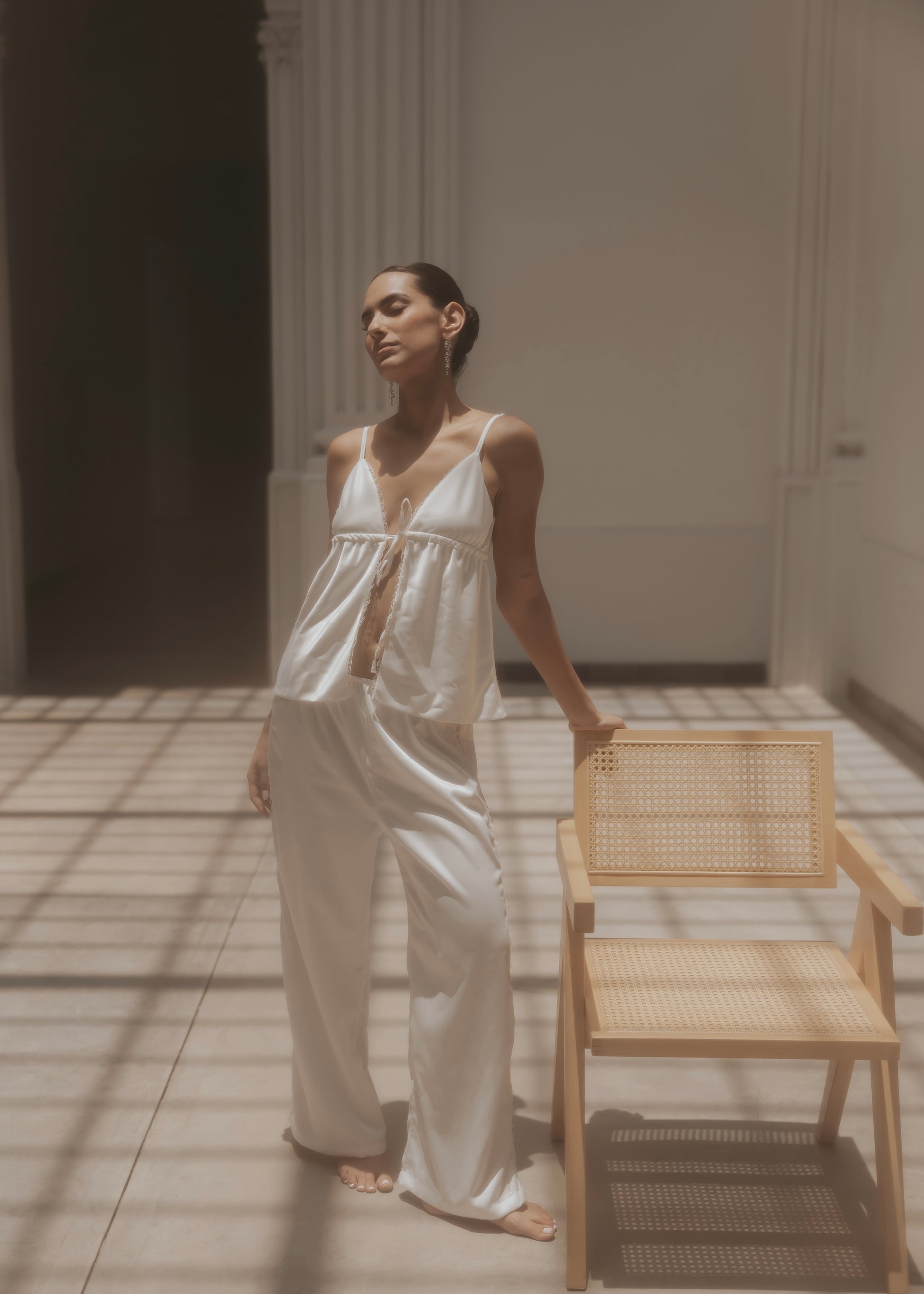 Pijama de satín suave con delicados detalles de encaje color blanco.