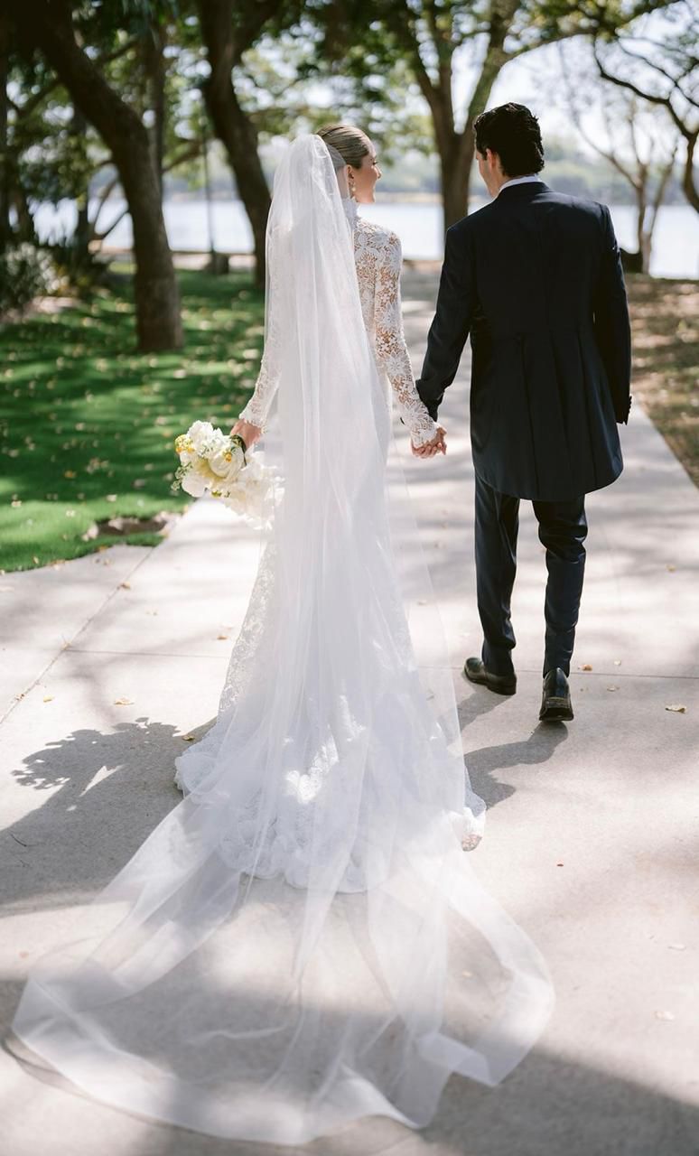 El tamaño más común de velo es el de 3 metros, la novia en la foto está usando uno de 3 metros.