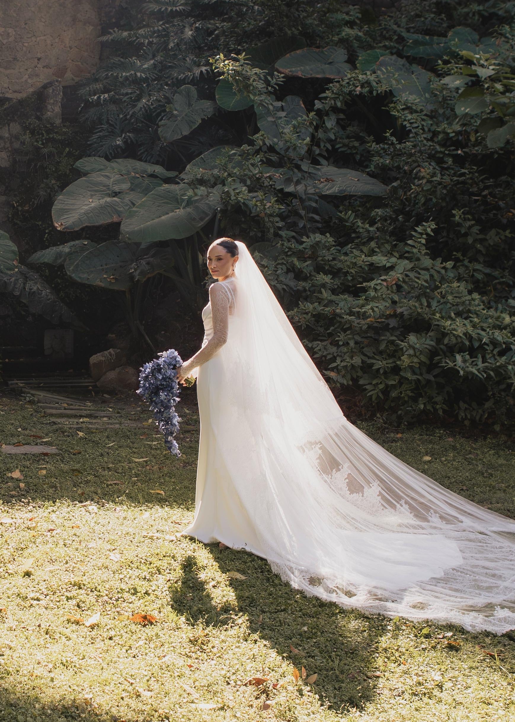 El tamaño más común de velo es el de 3 metros, la novia en la foto está usando uno de 3 metros velado.